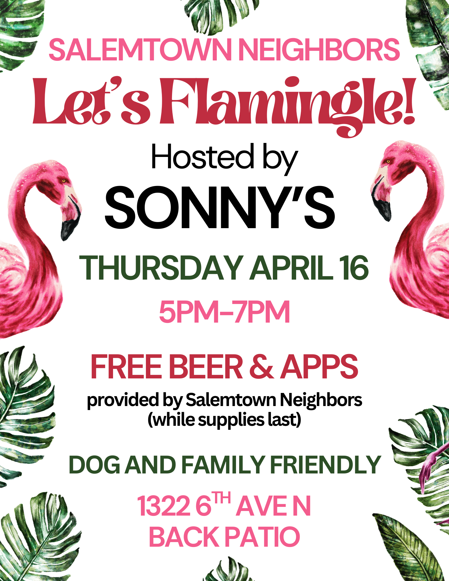 Pink Flamingo season is here! This casual get-together among neighbors takes place in rotating front yards with pink flamingos dotting the lawn, acting as an invitation for people to stop by and socialize — no need to RSVP! It’s a great opportunity to meet some of your Salemtown neighbors. All you need to do is BYOB! Pink Flamingos are dog- and family-friendly.