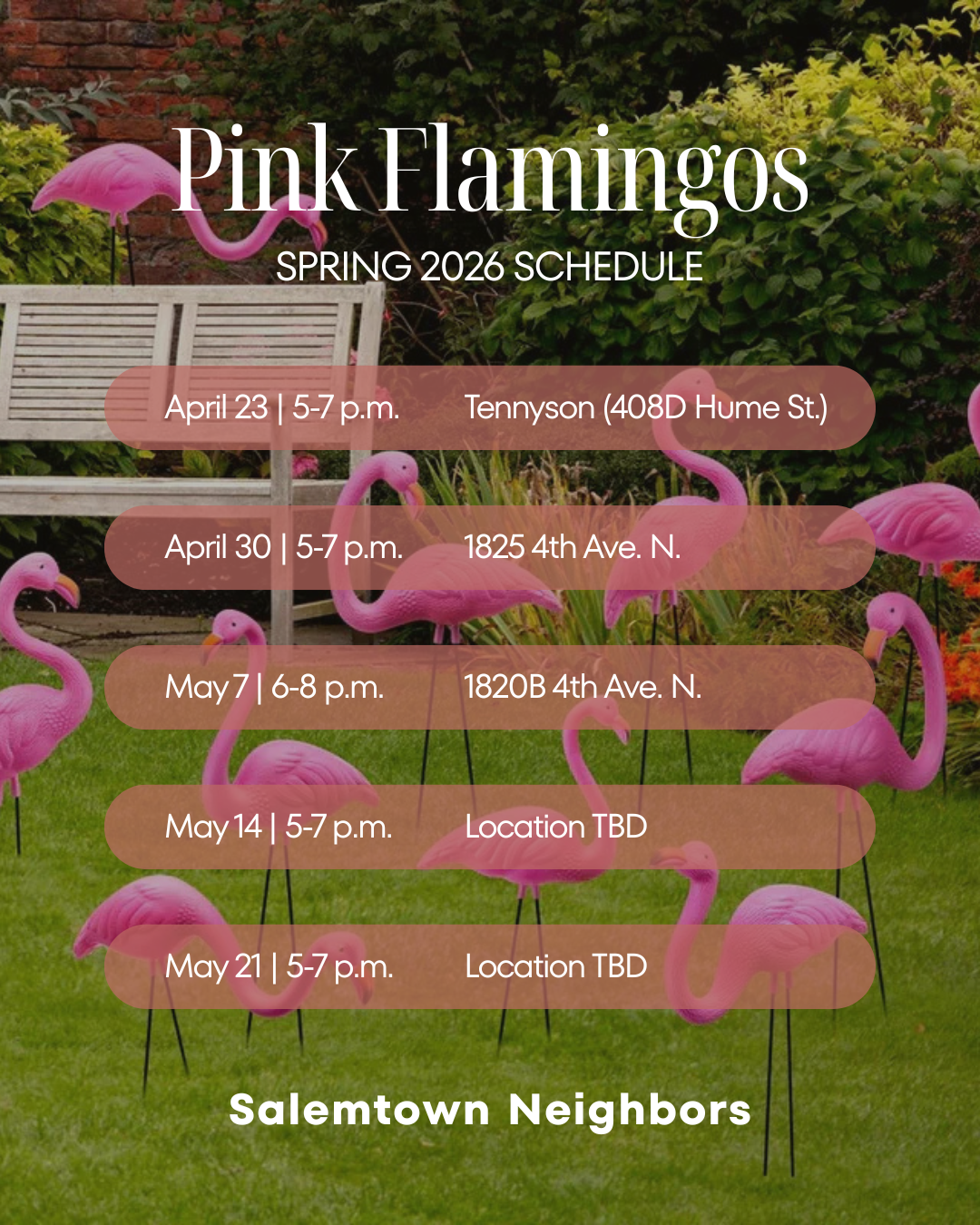 Pink Flamingo season is here! This casual get-together among neighbors takes place in rotating front yards with pink flamingos dotting the lawn, acting as an invitation for people to stop by and socialize — no need to RSVP! It’s a great opportunity to meet some of your Salemtown neighbors. All you need to do is BYOB! Pink Flamingos are dog- and family-friendly.
